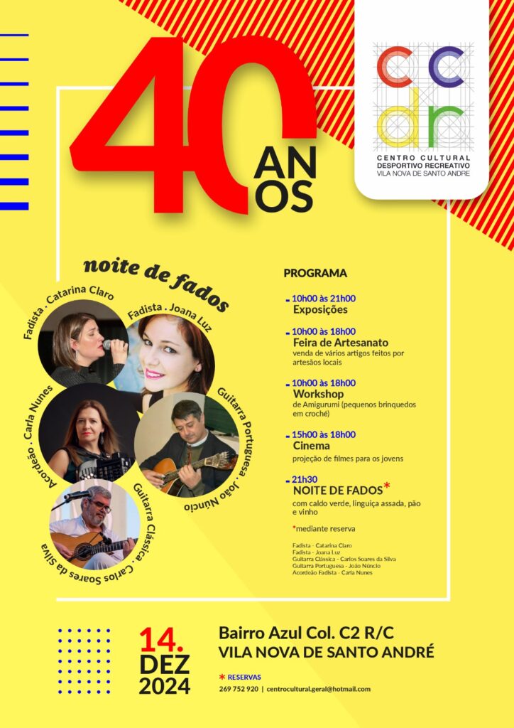 Na noite em que o Centro Cultural de Vila Nova de Santo André, celebrou o seu 40.º aniversário, fundado a 12 de dezembro de 1984, realizámos uma memorável noite de fados.